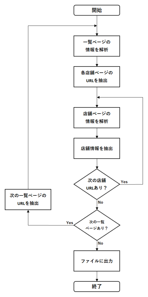 手動で考えた場合との違う点として、一覧ページから各店舗ページのURLを一覧で取得できる(できない場合もありますが)ため、手動の「STEP4 一覧ページに戻る。」というステップは省略されています。つまり、一覧ページに戻らなくても次の店舗URLが分かっているため、一覧ページに戻る必要はなくなるということです。