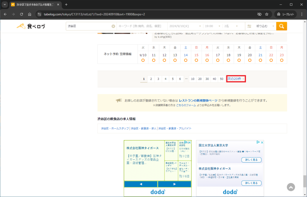 次の一覧ページがあるか判定する場合、手動ではどのように判定するか考えます。私であればページ下部の次の20件という文字があるかで判定します。