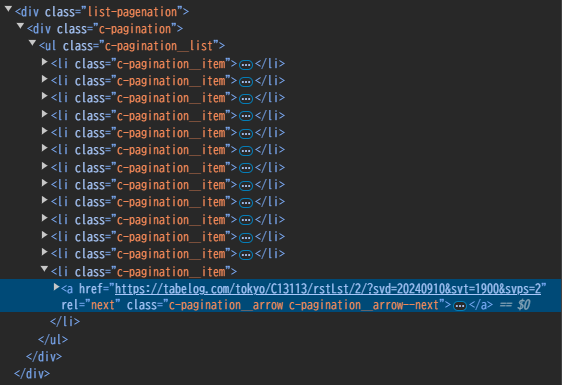aタグでrelに次ページを表しそうなnextという名前がついていますね。他にもそのような要素があったら嫌なのでページネーションを表しそうな名前がついている親要素のタグにも制限をかけてnext_a_tagを取得します。